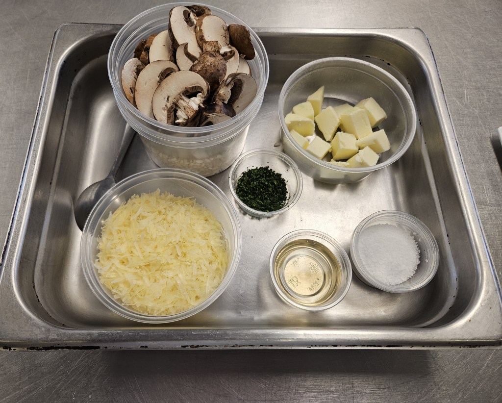 Today’s class marked a critical shift in our lab work. Up until this point, we’ve been doing one-off techniques and dishes, with the most complicated recipe being a bruschetta. Today moved us into actual recipes using starches: Steamed Rice, Rice Pilaf, Whipped Potatoes, and Risotto.
