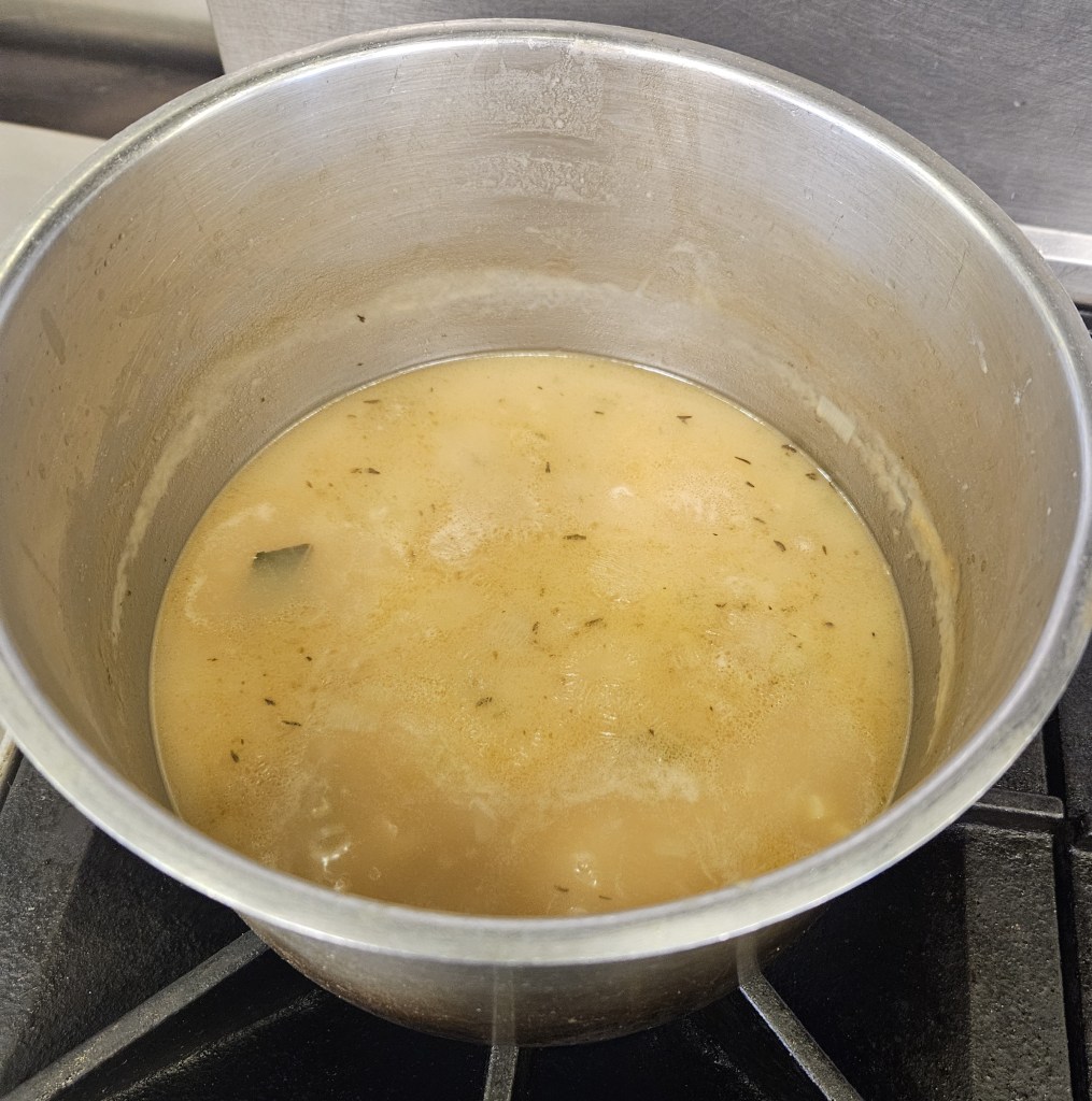 Sauce-making is a lot of “hurry up and wait,” as Chef says. You prep your ingredients, get everything hot, and…watch…and wait…and wait…and watch. Things can change from hot to scorched in a heartbeat, so you can never let your pots go unattended. The result is rows of culinary students staring at burners for hours. It also feels pointless when you don’t fully understand the final results. I struggled this week as I stared at opaque white and opaque brown pots. What was the point? I didn’t understand. Until I tasted the final results.