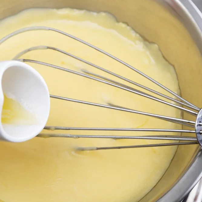 4. Slowly add warmed clarified butter and continue beating.