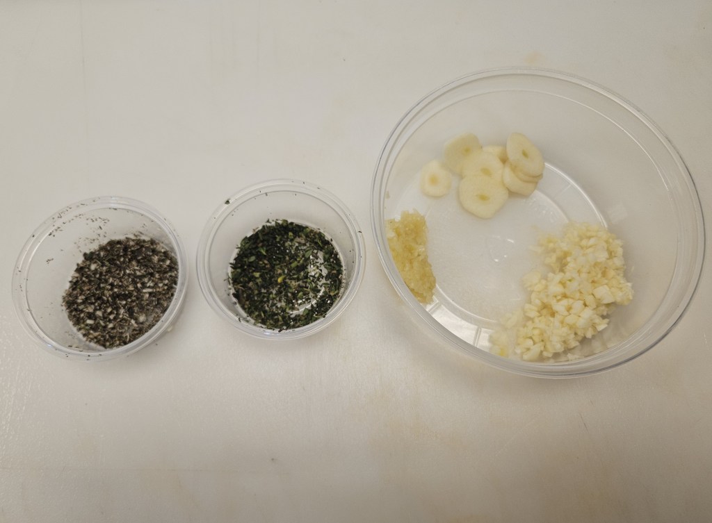 Chopped herb practice, and garlic three ways. I’ll never go back to buying garlic paste again.