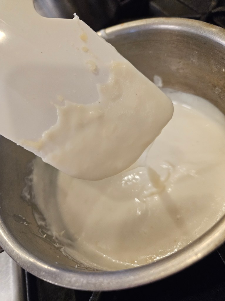 Mornay sauce is a cheesy enhancement of Bechamel. Sauce preparation is a lot of dipping a spatula and watching it drip, striving for that ideal nappe consistency.