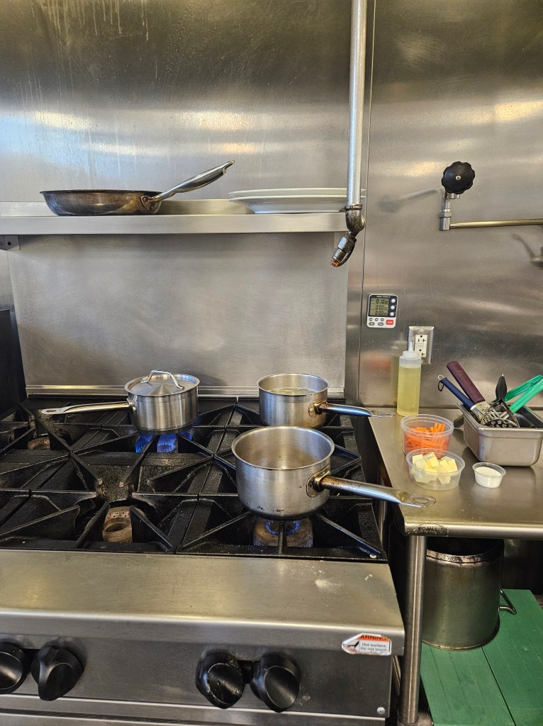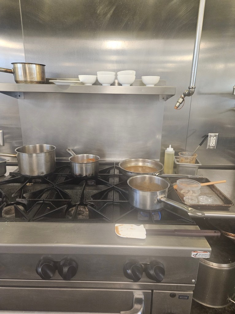 Sauces (and soups, next week) need to be served in hot bowls with clean edges. Juggling pots, burners, ladles, and the serving utensils is a massive undertaking. I’ve said it before. Even the simplest restaurant dishes are the result of hours of painstaking planning, execution, and diligence from workers pushed to physical limits. The next time you go out, and enjoy even one bite of your plate, I encourage you to think about all the bizarre and arduous steps that it took to bring you that joy. Tip well, praise often, and eat out ❤