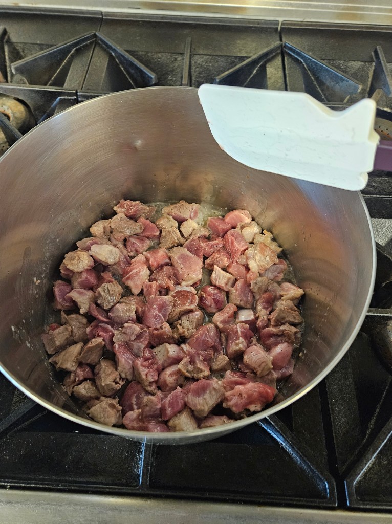 Delicious Green Chile Stew in process, close to ready for presentation. A triumphant dish needs an epic topping, though.