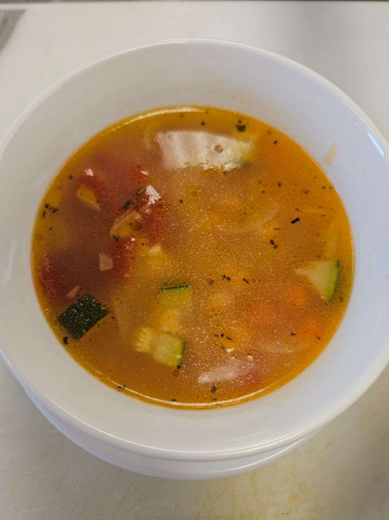 Clear broth with diced parsnips, carrots, celery, and peas.