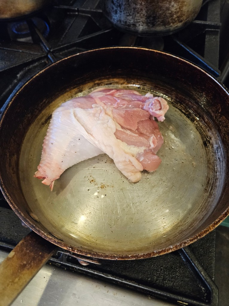 The chicken quarters were massive. The older pans in the lab have bowed centers, so I had to keep moving them around to get a sear (I was not very successful, and still came out with some flabby skin).