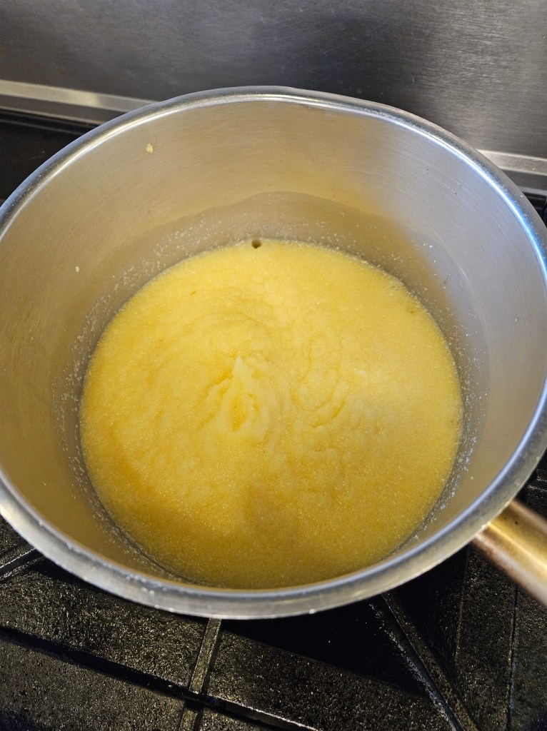 I was overjoyed to be working with polenta. I ran around the kitchen espousing the simple deliciousness of this side. I felt my Italian ancestors beaming as I cooked it down.