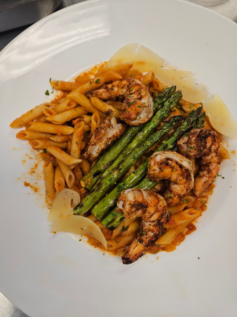 Grilled Cajun Shrimp Pasta with Grilled Asparagus, Creole Cream Sauce, and Parmesan Cheese garnish