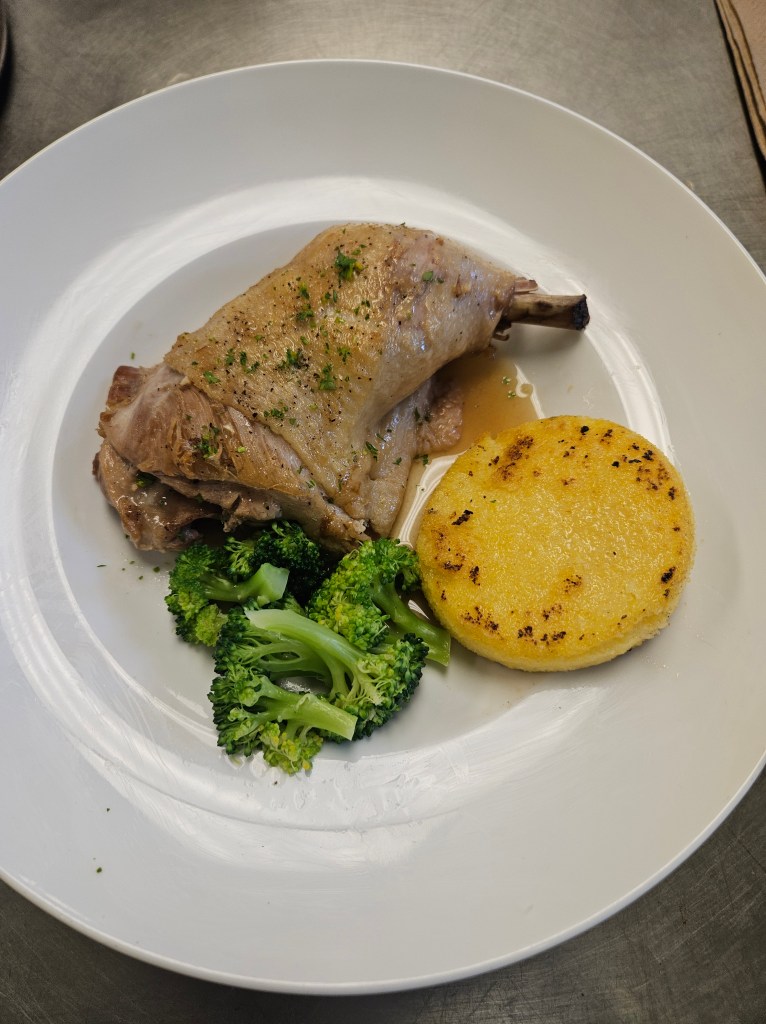 Braised Chicken Leg with Polenta Cake, Steamed Broccoli, and Veloute Sauce