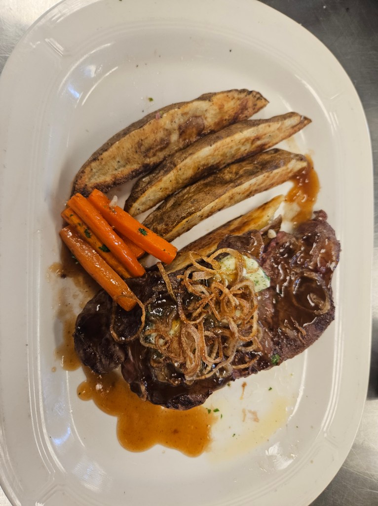 Ribeye Steak with Roasted Potato Wedges, Carrots Vichy, and Fried Shallots, drizzled with Demi Sauce and topped with Compound Butter