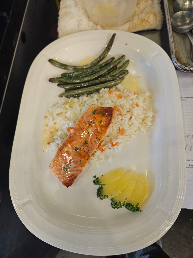 Sauteed Salmon with Rice Pilaf, Haricots Verts, Beurre Blanc Sauce, and Lemon Supremes garnish