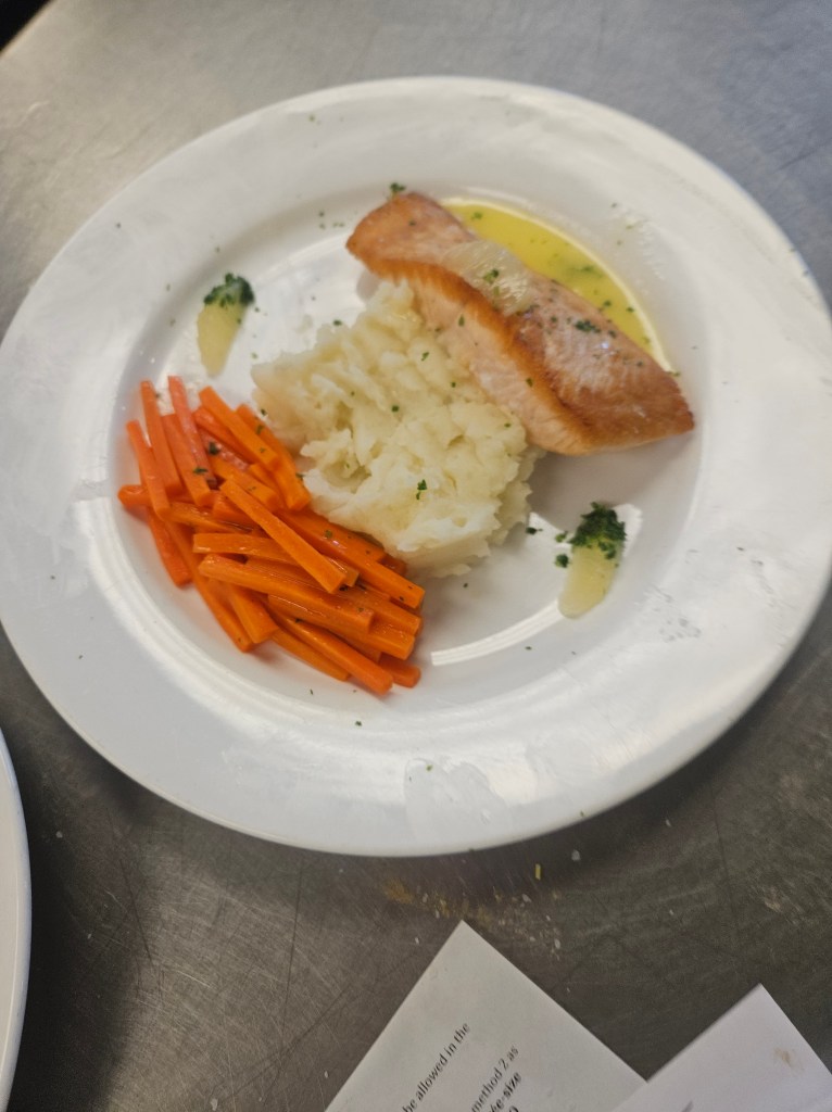 The final weeks of class had us preparing full entree plates served in aesthetically pleasing ways at correct temperatures. Planning is critical, especially for someone without industry experience like me. It’s incredibly difficult to keep certain foods hot while also cooking others. If you’ve ever made Thanksgiving dinner alone, you have an inkling as to what its like. Some items need to be served immediately. Others can hold, but only under certain conditions. We’re also sharing kitchen space. (I blessed my tiny home counters that helped teach me how to work clean in a contained space). Then, there’s the pressure of making the plate beautiful. I made numerous errors and learned a lot. It’s all so much harder than it looks!
