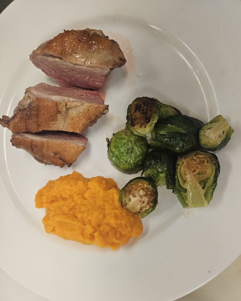 Roasted duck breast with butternut squash puree and caramelized brussel sprouts. My blood orange gastrique did not make it to the plate, due to time. I also cut the duck improperly. Cutting it length-wise is much prettier. Everything tasted great, though!