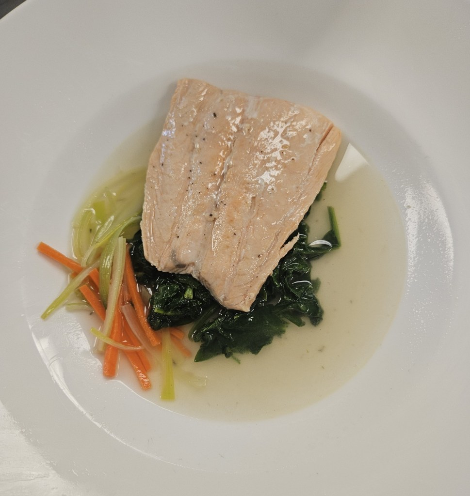 Poached salmon in nage sauce with sauteed spinach and julienned vegetables. I overcooked the salmon slightly, which you can see via the small amounts of white albumin on the meat. My plating overall was okay, but the vegetables could have been arranged more delicately.